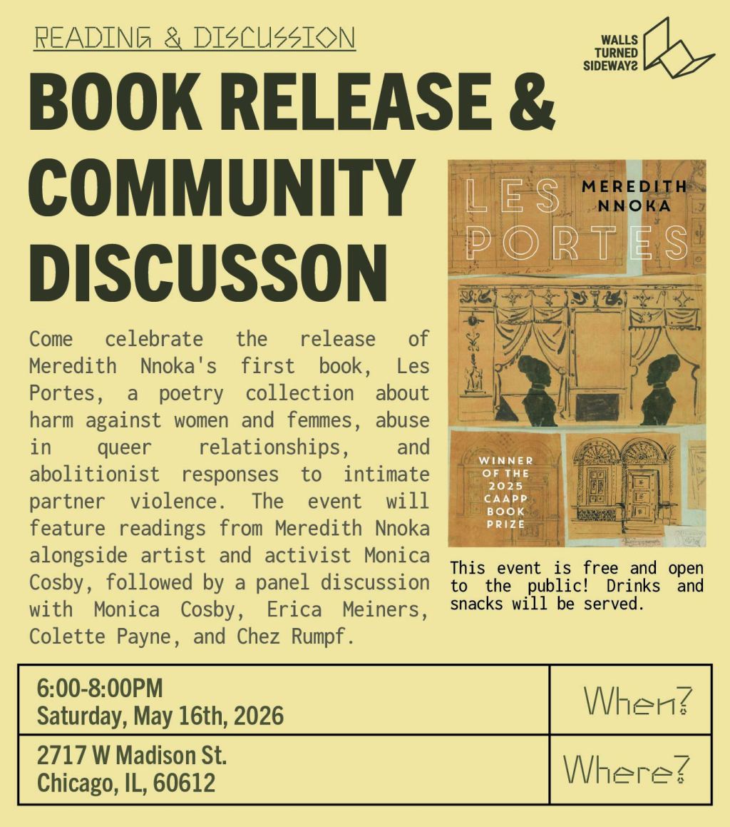 Come celebrate the release of Meredith’s first book, Les Portes, at Walls Turned Sideways (2717 W Madison St, Chicago) on May 16 at 6 p.m. The event will feature readings from Meredith Nnoka alongside artist and activist Monica Cosby, followed by a panel discussion with Monica Cosby, Erica Meiners, Colette Payne, and Chez Rumpf. This event is free and open to the public. Drinks and snacks will be served.