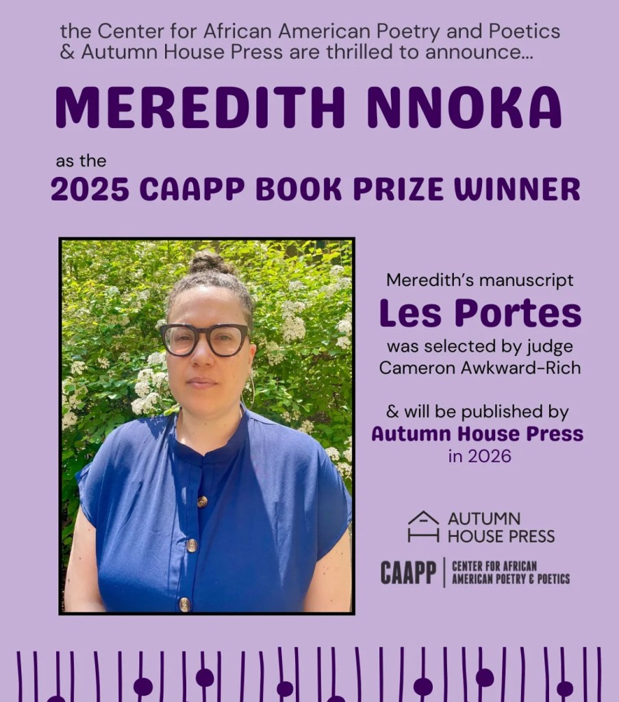 Some incredible news: My first book, Les Portes, won the 2025 Center for African American Poetry and Poetics Book Prize from the University of Pittsburgh and Autumn House Press! Les Portes charts generations of harm against women and femmes, in my life and otherwise, alongside the interlocking issues of domestic violence and mass incarceration. It will be published and available for purchase in spring 2026.